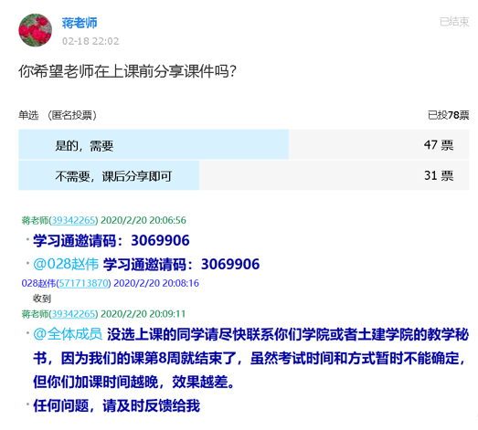 但我对同学的要求还是与在校时是一致的:我的授课内容经过了大幅的精简和改革,需要他们在课余花时间阅读教材和做练习;我要求他们在上课之前对照我自编提供的《自学指南》跟进;我希望他们提前预习,带着问题来到课堂听讲、讨论;我本来一直都是课后才分享课件,但面对目前的特殊情况,特意作了调查,以便随时调整授课策略。