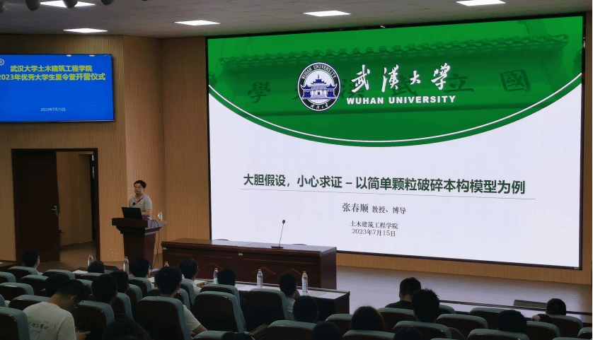 活动第四项,张春顺教授作题为《大胆假设,小心求证——以简单颗粒破碎本构模型为例》的主题报告。张教授从缘起、推导与应用三个方面,介绍了科研成果从理论概念到实验证明到工程应用的案例,他以极具感染力的语言讲述了科研过程的新发现以及突破科研瓶颈的喜悦,鼓励了“准研究生”们积极开启科研征途。