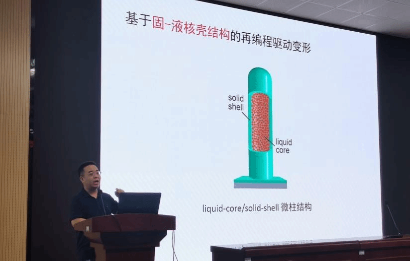 活动第五项,王正直教授作《光聚合多场耦合实验力学方法及微结构设计制造研究》报告。王教授从简单的力学模型,到带领课题组对基于混合微柱结构的程序化驱动变形进行了深入探索,并最终搭建了国内首台光聚合收缩应力原位耦合测试装置,实现了对快速光聚合过程中多参量实时精准测量,为光聚合材料的性能调控和优化提供可靠的实验平台。王老师用详实的案例介绍了科学研究的从始至终,他也鼓励了营员们科研从“简单”做起。