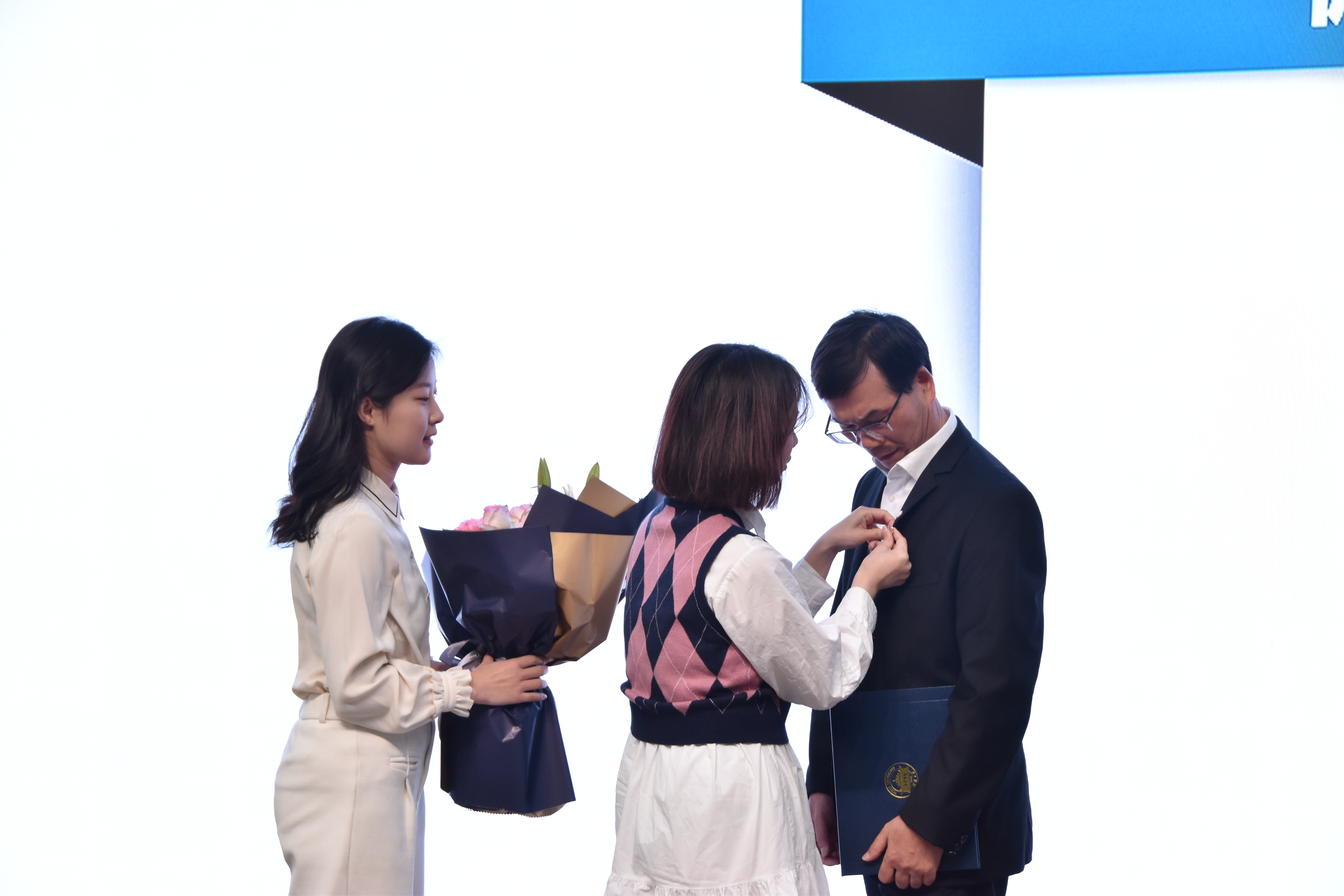 学生代表向陆建新教授献花及佩戴校徽