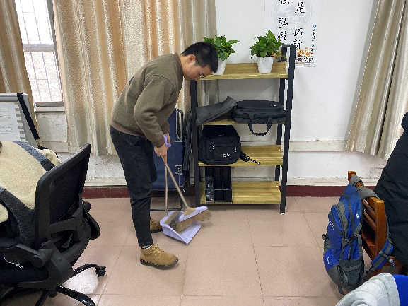活动伊始,支部书记张全太为各位同学分配任务,之后同志们便回到自己所在的研修室,迅速投入劳动中。大家配合默契,有的扫地,有的擦桌子,有的拖地,有的浇花,大家分工明确,热情高涨。在支部同志的热情劳动氛围的感染下,研修室的同学们也加入到了劳动的队伍中。经过大家的认真打扫,研修室地面,墙面,桌子,窗台焕然一新。在新的一年的开始,同学们共同创建出了一个更加整洁、优美、舒适的学习环境,为一年的健康学习打下了坚实的基础。