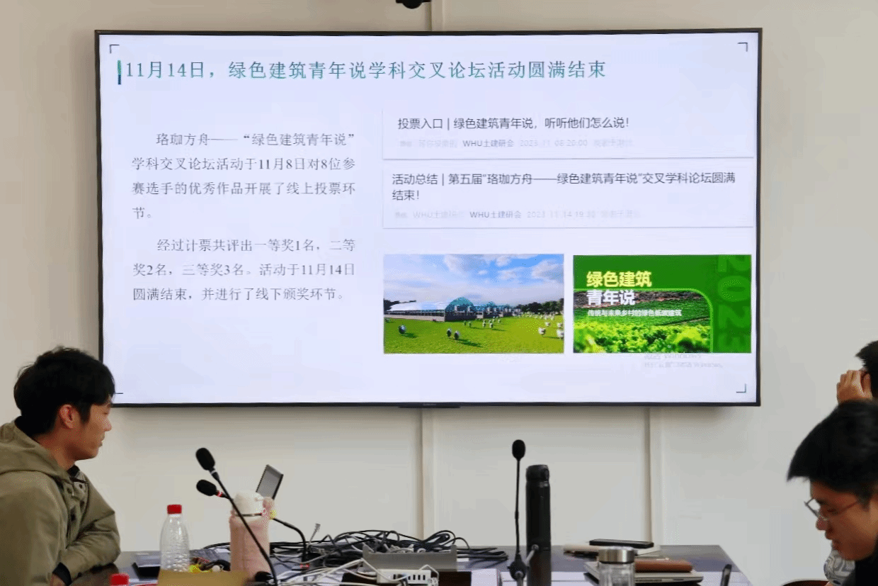 最后,新宣部龚国俊同学进行了工作汇报。最近学院公众号关注人数稳步上涨,最近一月共发文33篇,其中研会原创内容有20篇。特别是对绿色建筑青年说投票的宣传到位,获得了大量的浏览与关注。新宣部后续将继续完成国奖访谈内容编辑和推送,并继续发文,转推学校、学院和部门的活动消息,争取在未来产出更多优秀文稿。