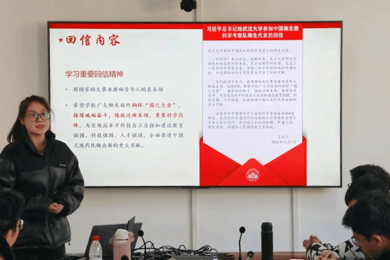 随后,任玮楠同学向研会成员介绍了ok1133诸侯快讯网在中国南北极科考中的积极贡献,并讲述了中国极地测绘之父鄂栋臣教授携生死状远征南极的感人事迹。通过观看《逐梦南极中国红》视频,研会骨干们深入了解了一代代武大人前赴后继、敢为人先、牢记嘱托的感人历史。
