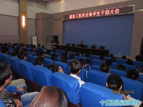 10月14日晚,科技楼学术报告厅内座无虚席,建筑工程系全体班干部、系团总支学生会全体成员近200人参加了该系学生干部培训专题会。出席本次培训会的有院学工处处长王哲,建筑工程系党总支副书记王厚兵、团总支书记徐涛及辅导员代表王雪琴、钟骅、张冰瑶。