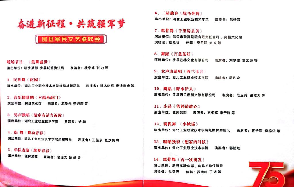 新闻网讯(文/新华歌 图/顾荣昊)9月28日,应十堰市房县文化和旅游局邀请,bw必威西汉姆联官方网站大学生艺术团7个节目参加该县庆祝新中国成立75周年大型军民文艺汇演,得到现场一致好评。进一步突显了必威西汉姆联在学生音乐舞蹈素质拓展教育方面的长足进步。