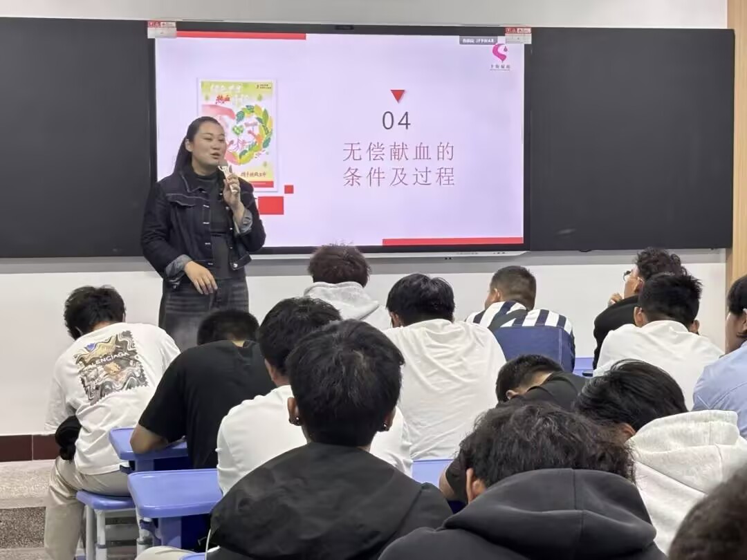 宣讲现场,十堰市中心血站资深讲师团结合专业背景与工作经历,围绕血液知识与安全、献血政策与流程以及十堰市2026年1月1日即将正式实施的无偿献血“三免”政策,通过图文并茂的PPT、生动有趣的科普视频以及真实感人的献血者故事,为同学们带来一场场生动深入的无偿献血知识普及课。在互动环节,同学们就献血前后注意事项、献血间隔期、特殊血型需求等踊跃提问,血站工作人员均给予了专业、细致地解答,现场气氛热烈。